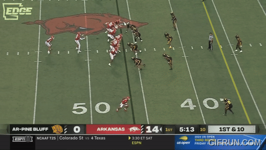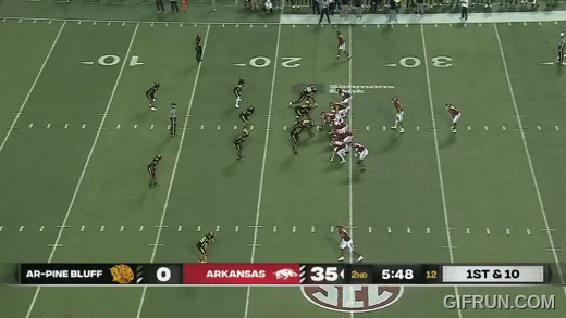 We saw above that Petrino will move the pocket to buy time for his quarterback, but the Hogs have to be able to consistently move forward to have a chance to win. That means no protection breakdowns, and it means plenty of holes for Jackson to run through.
