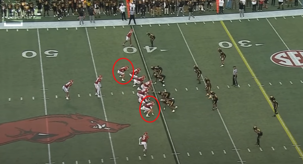 The touchdown above to Washington came out of a twin-TE set, with one receiver to each side and two tight ends together. The Hogs used that one twice from Pistol, and once from Shotgun.