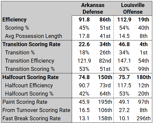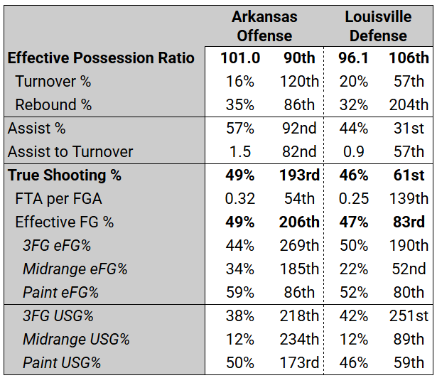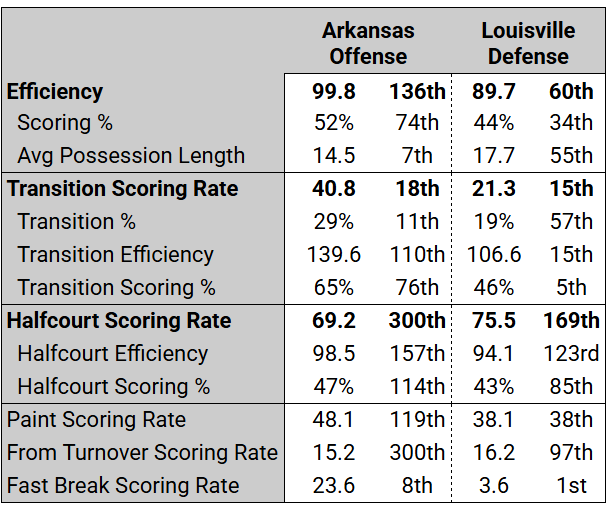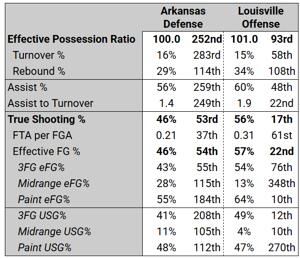 The biggest concern is the very bottom stat: Arkansas has struggled a bit in halfcourt and is highly dependent on fast break points (8th), but no team in college basketball is better than Louisville at preventing fast break points. The good news is that Arkansas’ iffy halfcourt offense is going to get a shot at an iffy halfcourt defense. Maybe this will be the game that leads to the breakthrough.