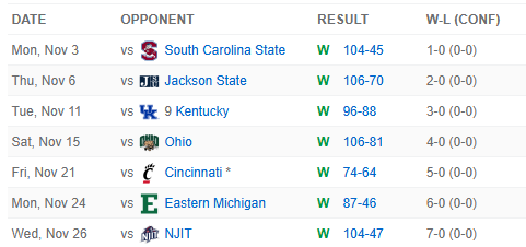 The other high-volume guy on offense is 6’4 Xavier transfer Ryan Conwell, who is sitting on 20 points per game. Unlike Brown, the advanced stats love this guy, and it’s easy to see why: he’s shooting 45% from beyond the arc on very high volume, boosting his true shooting to an eye-popping 68% (that’s 1.36 points per shot chance). He never turns the ball over (just 6% turnover rate), and he rebounds pretty well for his size. His consistency in shooting is remarkable: he was just 1 of 5 from downtown against Eastern Michigan, but he’s made at least 40% of his 3-point attempts in every other game, including 4 of 10 against Kentucky and 5 of 10 against Cincinnati.