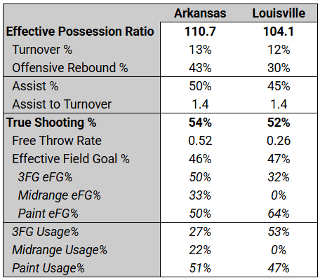 Neither team could do much in fast break (remember from the preview, Louisville came in ranked 1st in the nation at preventing fast break points), but the Hogs dominated in halfcourt offense, 74-56, while Louisville’s 14 extra transition possessions amounted to only nine additional points.