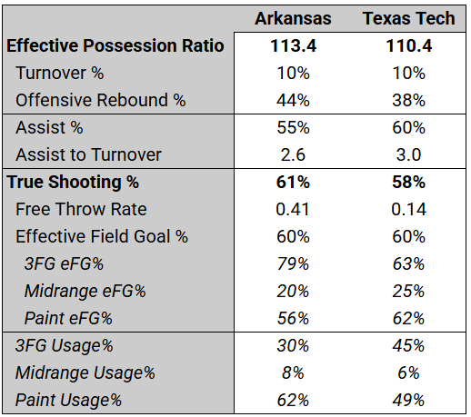 As we saw against Louisville, the Hogs dominated fast break points (18-4) and won points off turnovers again (10-5). They also ate up Tech’s halfcourt defense, scoring on a stagging 62% of halfcourt possessions. The Red Raider defense isn’t great, but that’s still really impressive against a good team.