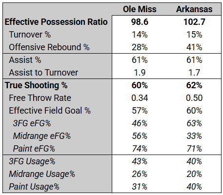 I mentioned in the preview that a weakness of Ole Miss defense is that it only works well if it has time to get set up. While the Hogs only had eight fast break points, their 14 transition possessions yielded 13 scoring trips and 28 points.
