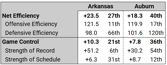 Model pick: Arkansas 88, Auburn 87. Get ready for some points. Auburn can score but their 120th-ranked defense is holding them back.