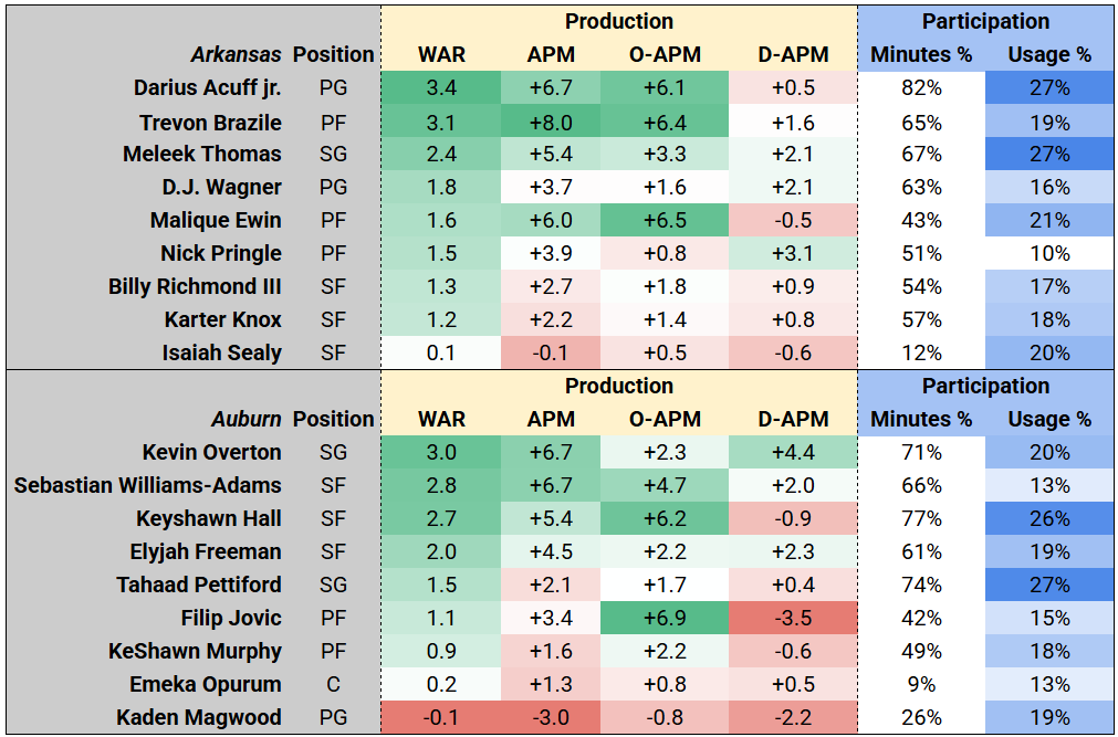 As you can see from the minutes numbers, Auburn doesn’t go deep into the bench. They have a clear five-man lineup that’s pretty small, and they’ll rotate two bigs when they need more size.
