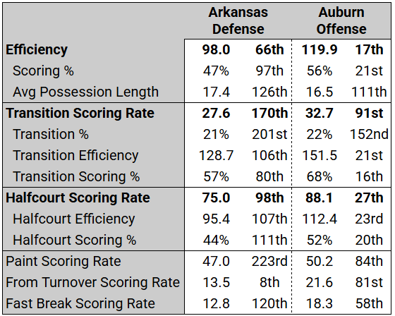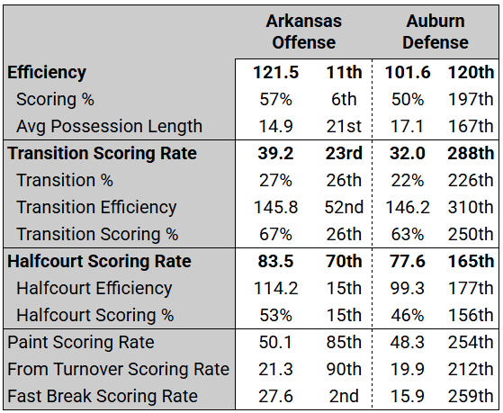 Get ready to run. Auburn’s aggressiveness in pursuing offensive rebounds leaves them vulnerable in transition opportunities. The Tigers allowed 27 transition points to Bethune-Cookman in their opener and it’s been all downhill sense. Texas A&M and Georgia – two of the fastest-paced teams in the SEC – punished them in transition as well. Auburn now ranks 310th in Opponent Transition Efficiency, 226th in Opponent Transition Rate, and 259th in Opponent Fast Break Scoring Rate. Arkansas obviously pours it in on fast break opportunities (2nd) and generally wants to play fast (26th in Transition Rate, 21st in Average Possession Length).