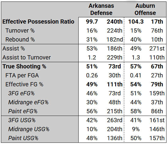 If you can protect the ball and rebound decently on defense, Auburn will give you all kinds of chances for easy buckets, as they are also bad in the paint (254th) and off turnovers (212th).